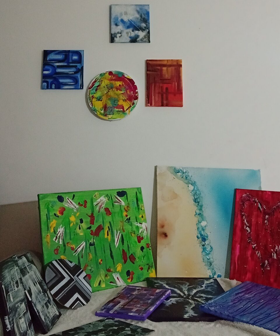 Realizzo quadri usando la classica tela o del cartoncino,utilizzando colori acrilici.